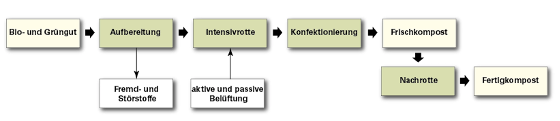 Bei der Kompostierung werden Bioabfälle unter Anwesenheit von Sauerstoff (aerob) mithilfe von Mikroorganismen abgebaut. Es bleibt ein nährstoffhaltiger Kompost zurück, der in Abhängigkeit vom Rottegrad zur Bodenverbesserung, zur Düngung oder als Mischkomponente für Kultursubstrate eingesetzt werden kann. Der Kompostierungsprozess (Rotte) verläuft in der Regel in zwei Hauptschritten: Der Intensivrotte und einer mehrwöchigen Nachrotte.